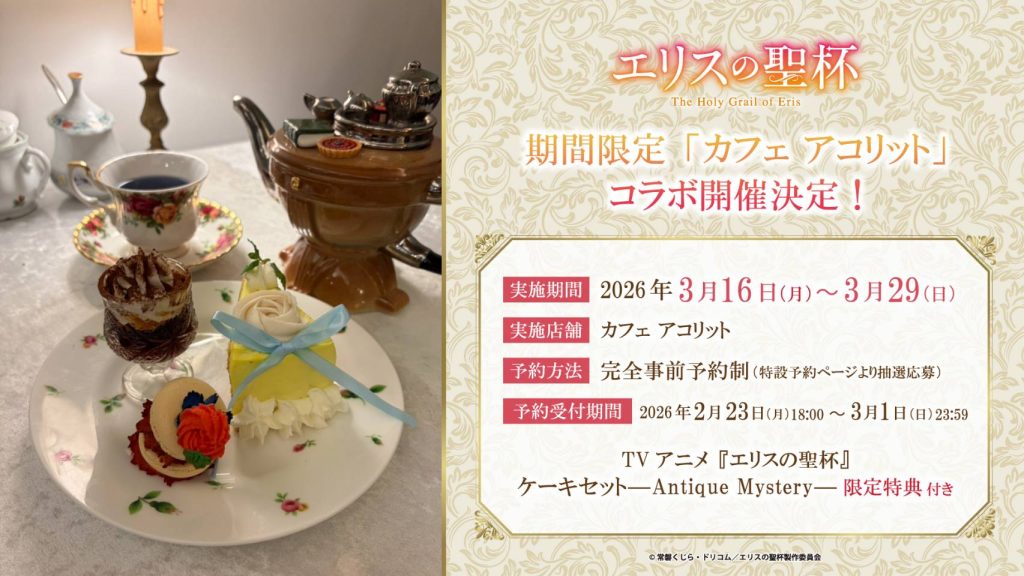 TVアニメ『エリスの聖杯』と、日替わりの手作りケーキとヨーロッパ各地から集められた珠玉のアンティーク食器が人々を魅了する目白の喫茶店「カフェ アコリット」の特別コラボレーションの事前予約(抽選制)を開始しました!