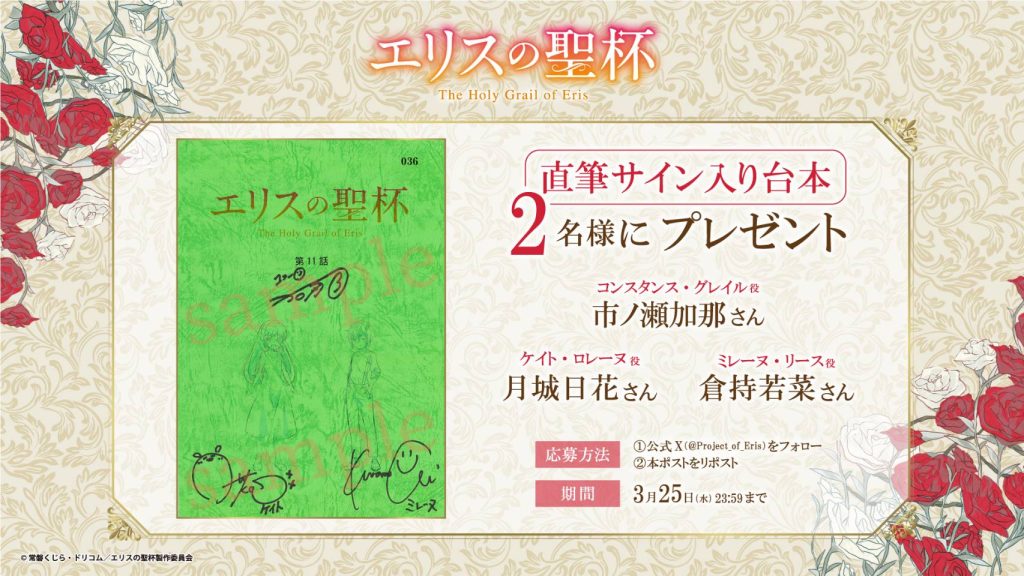 ■プレゼント商品 :「コンスタンス・グレイル役 市ノ瀬加那さん、ケイト・ロレーヌ役 月城日花さん、ミレーヌ・リース役 倉持若菜さんの直筆サイン入り台本(第11話)」…抽選で2名様